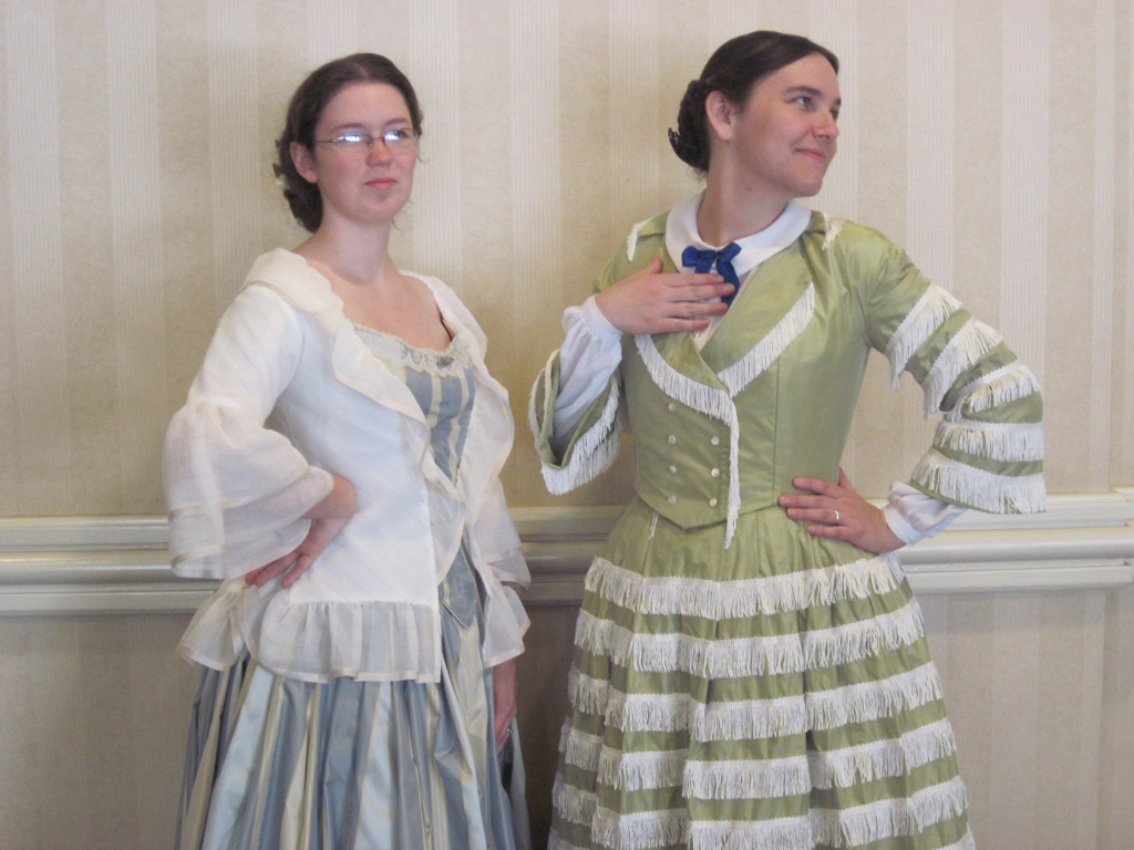 I fell in love with the blue striped dress on the left of the above fashion plate and immediately knew I had to make it. Luckly, my dear friend Sara decided she had to have the green dress on the right and hillarity ensued. We wore our dresses together at Costume College 2010 and posed with a framed copy of the fashion plate.