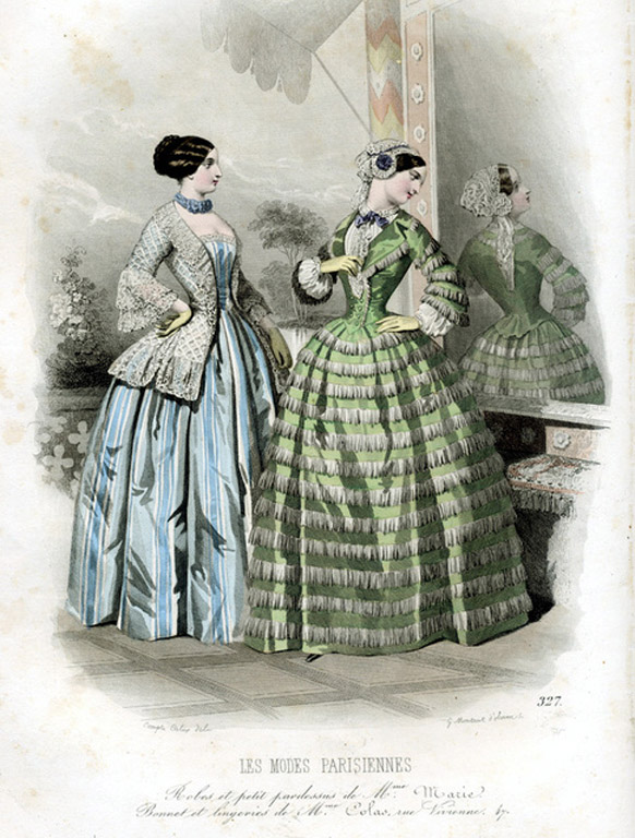A blue striped dress and sheer white jacket based off of an 1849 French fashion plate.