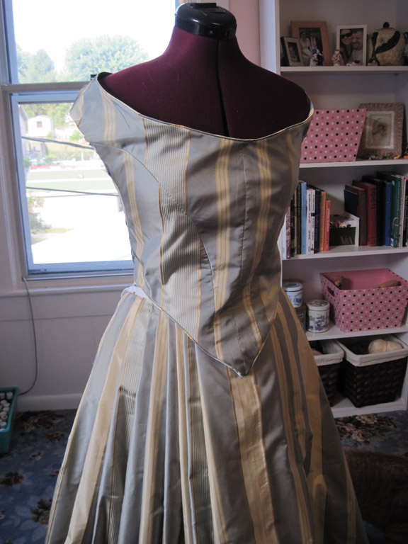 I decided to construct the outfit as an evening dress with removable jacket so I could wear it for other occasions. Needless to say, it doesn't fit my dress form at all.