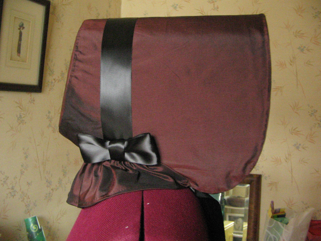 I also made a simple cottage bonnet from the Miller's Millinery Pattern using a brown/black changeable silk taffeta, but it is an incredibly unflattering style on me so no pictures of me in it.