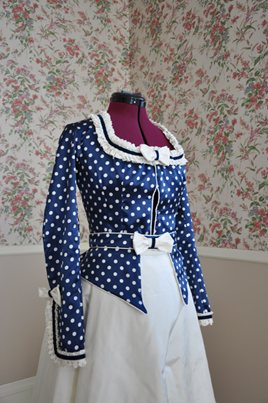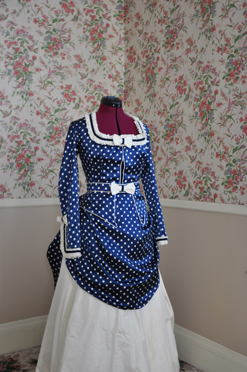An early 1870s outfit made from navy spotted silk charmeuse and accented with cream silk taffeta.