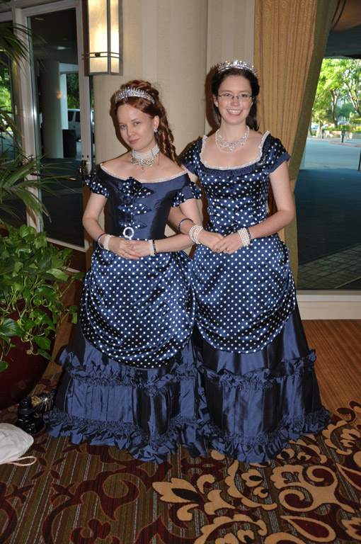 I used spotted silk charmuese for the main part of the bodice and trimmed the neckline and sleeves in plain blue taffeta. The bodice has little cap sleeves and closes in the front with self fabric covered buttons.
