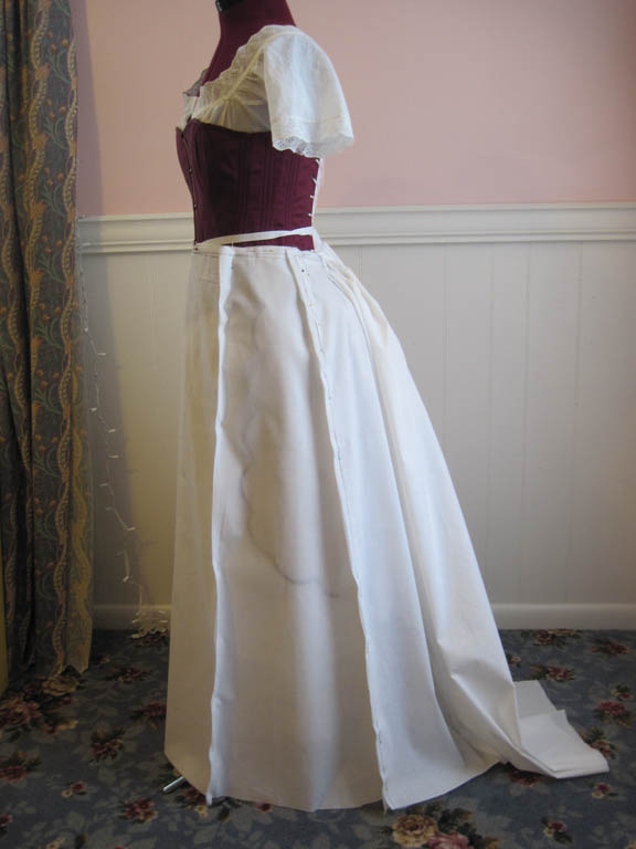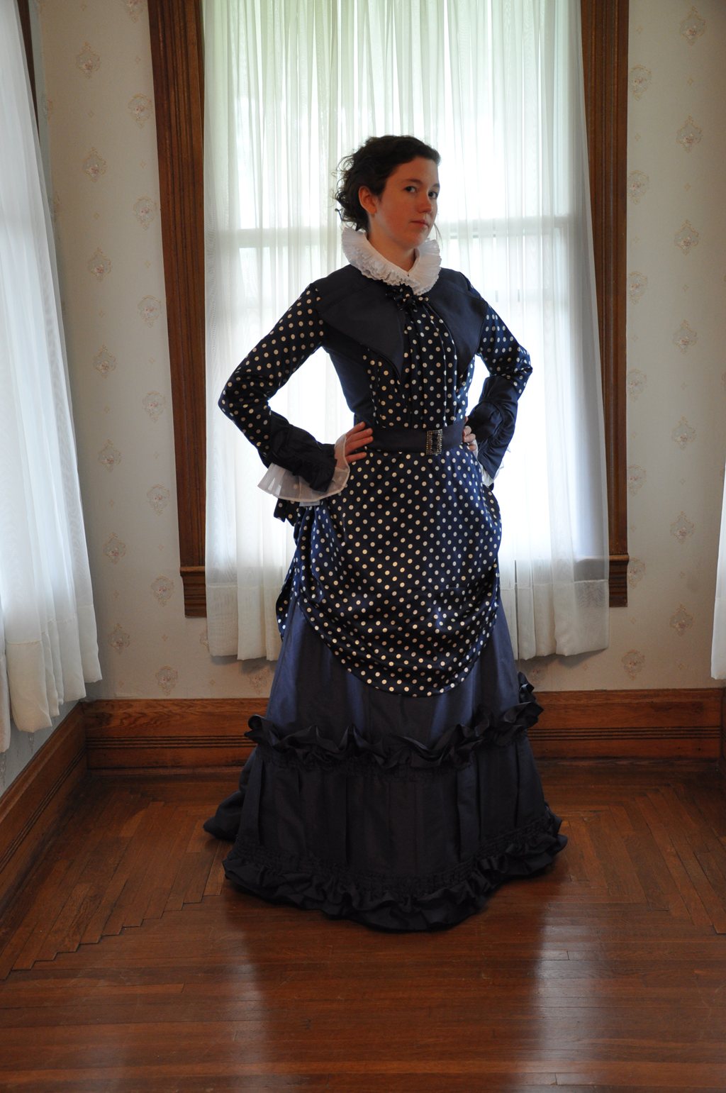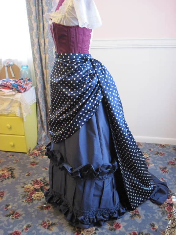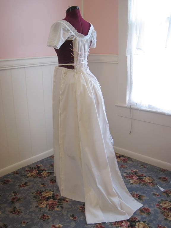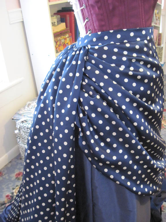 The over skirt is based on the 1870-1 overskirt on page 28-29 of Patterns of Fashion 2. I flat lined the silk charmeuse with the same cotton sateen as the underskirt. The front portion is simply hemmed, while the back section is faced with a 12 inch strip to avoid showing the lining when the skirt is polonaised. The front is a crescent shape with pleats on the side, like the original. The back is one width of fabric and the shaping is achieved using tapes that have been tacked to the fabric.
