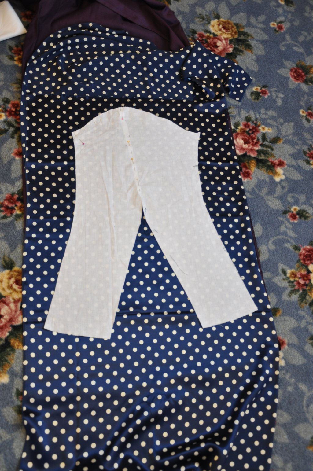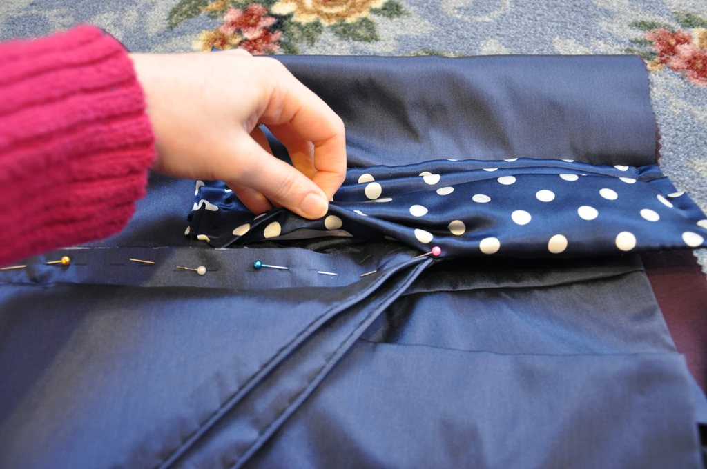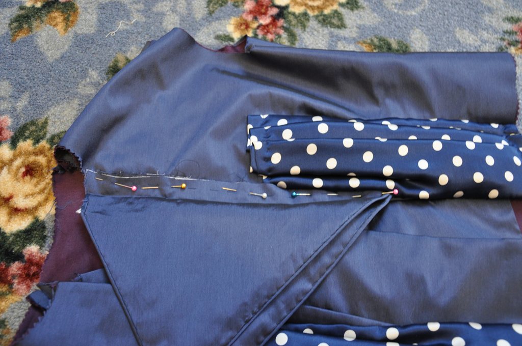 For the lapels and spotted pleats, I attached pieces of pleated charmeuse interlined with cotton organdy to the over bodice, angling them so they were flush with the bottom edge of the bodice but did not show under the top of the lapels. The lapels were then sandwiched between the bodice and the spotted pleats, making it appear that they came through the spotted part of the dress.