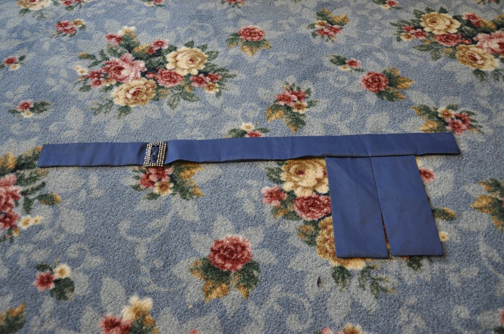 The belt and tails are made from the taffeta and interlined with cotton organdy. The tails are sewn to the back and the belt closes with a pin at the side seam. The buckle is actually part of a matching set of shoe buckles Katherine found on Ebay.