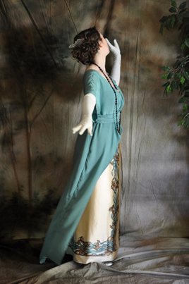 A circa 1912 dinner dress made from teal silk crepe and printed silk charmeuse.