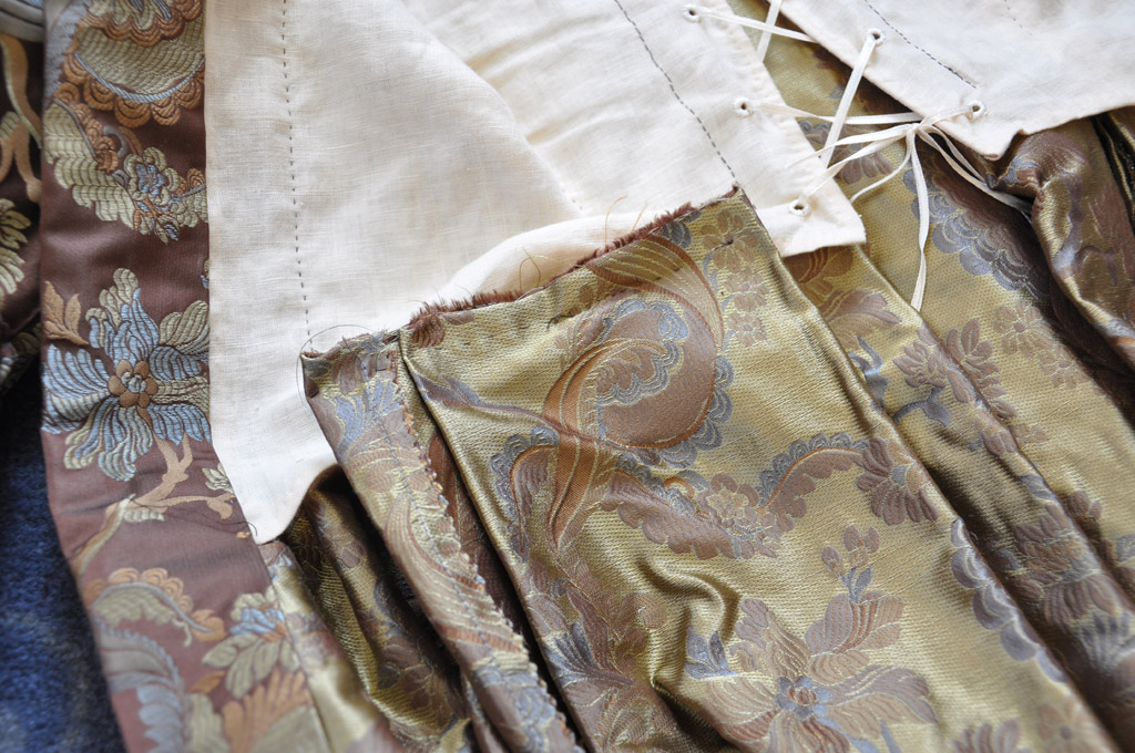 The back pleats, insides, and sleeves. The seams were stitched by folding over one seam allowance and topstitching the fabric with a spaced backstitch. Since the brocade frays terribly, I bound the sleeve seams with vintage rayone seambinding.