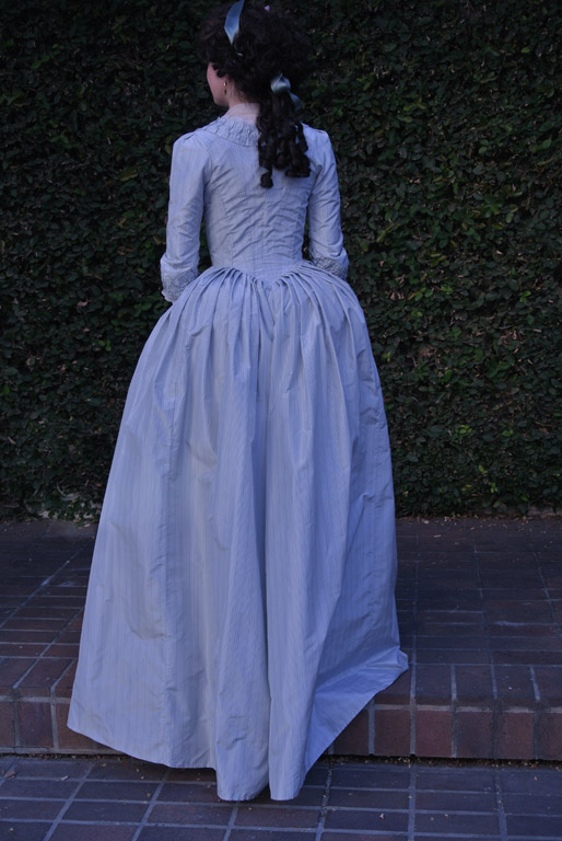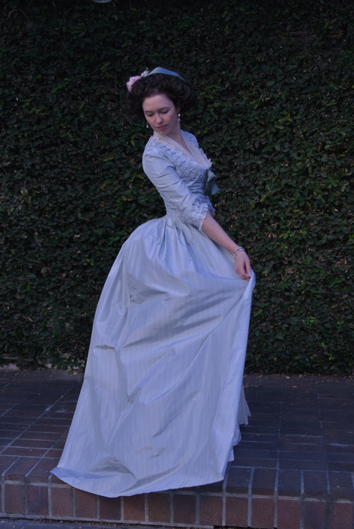 I wore my blue striped 1780s Italian Nightgown with a cream silk petticoat. For accessories, I wore clear paste bracelets and pink and clear paste earrings (again from