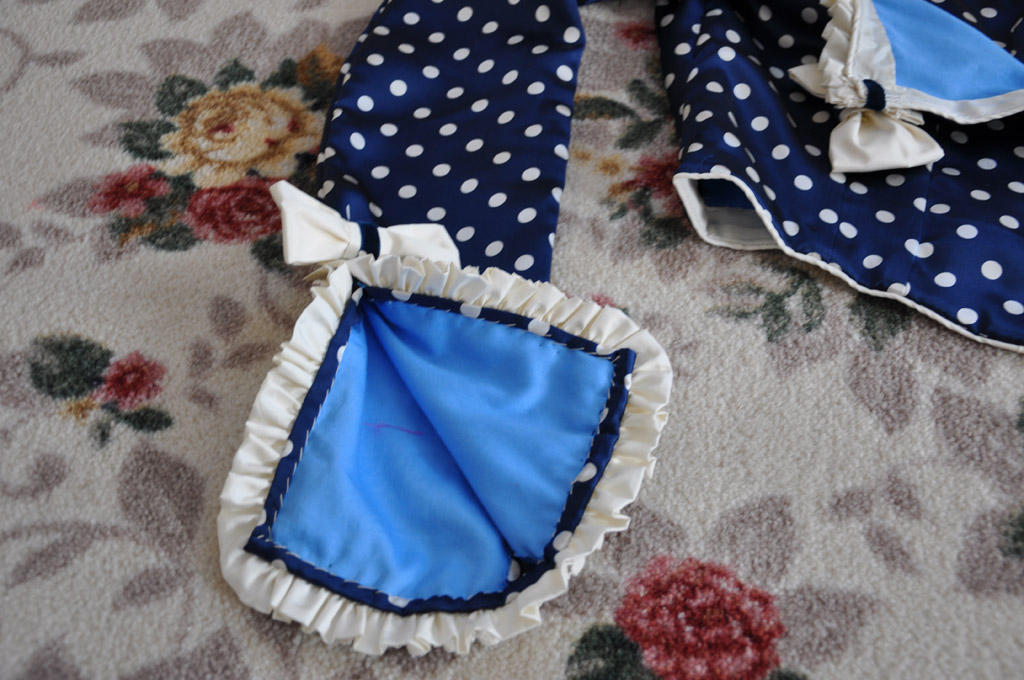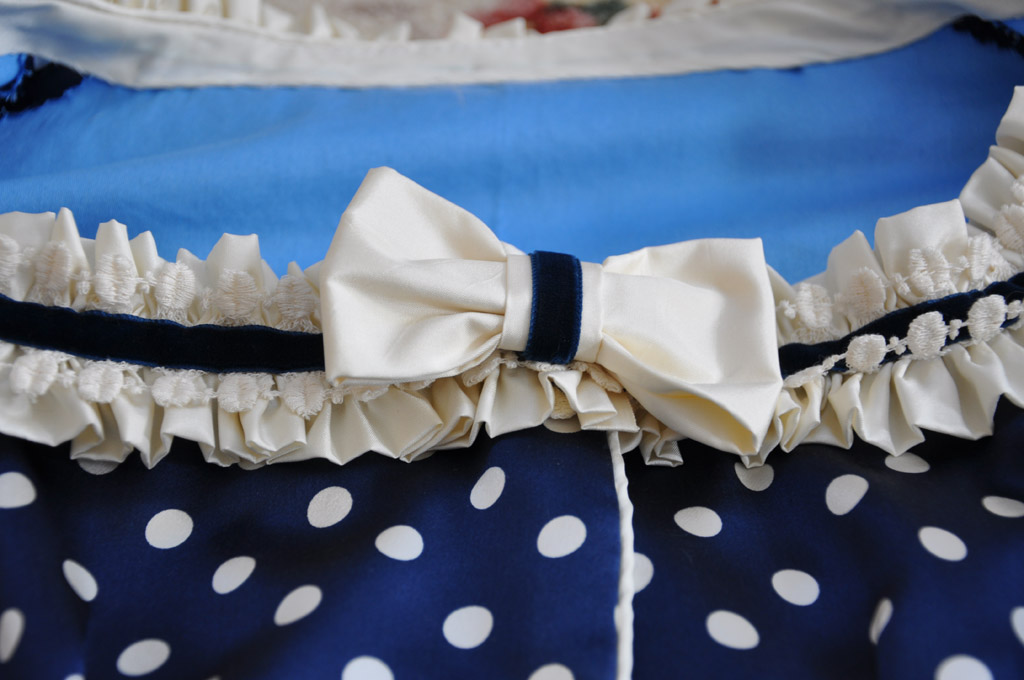 The neckline and sleeves are trimmed with gathered strips of cream silk, layered with vintage cotton lace and navy velvet ribbon. Silk bows with velvet ribbon finish off the neckline, peplum and sleeves. The outer sleeve seam was sewn to just above the wrist, the raw edges were then finished with a narrow hem and the decoration applied.