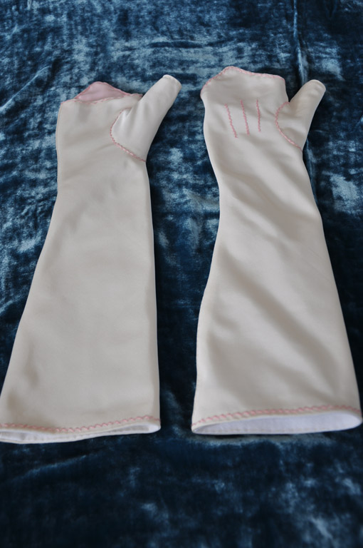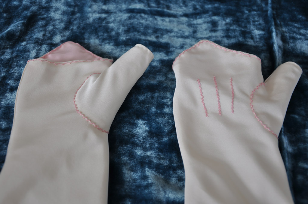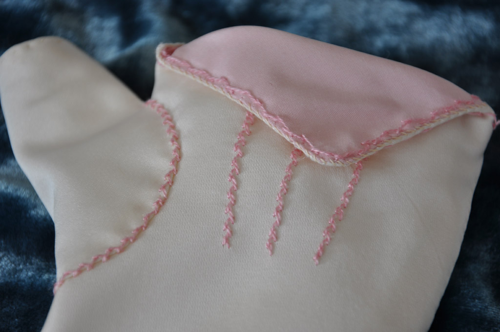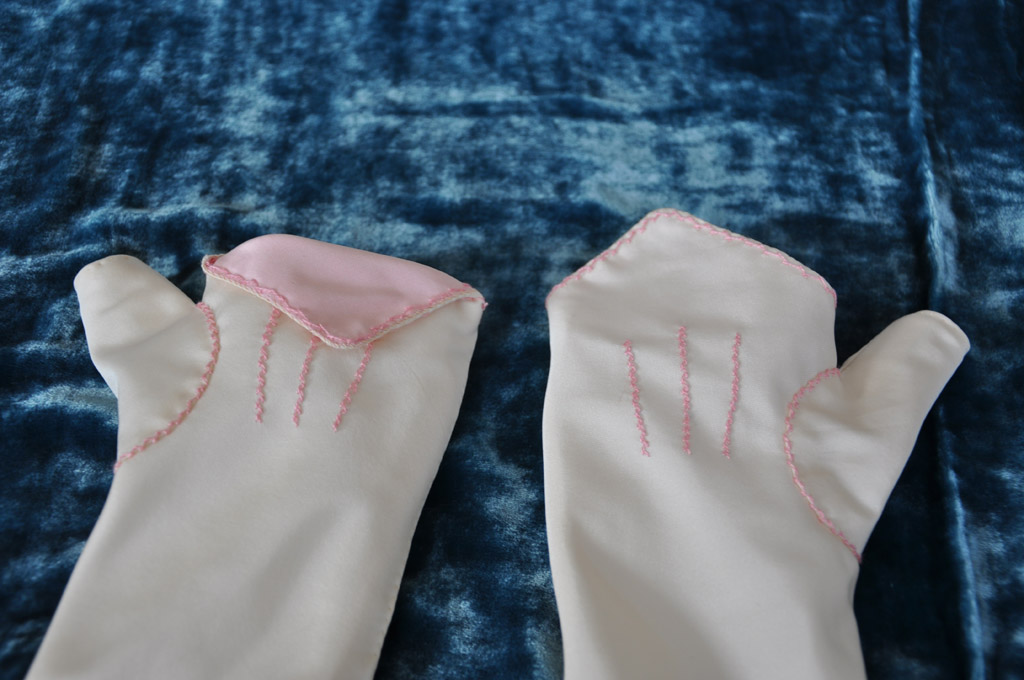 my previous brown pair. The lining (white linen) and outer fabric (cream silk) are sewn separately using a spaced backstitch. The lining is then inserted into the main piece and the two fabrics are turned under and edge stitched together. The points are lined in pale pink taffeta and I decorated the mitts with pink silk embroidery in a herringbone stitch.