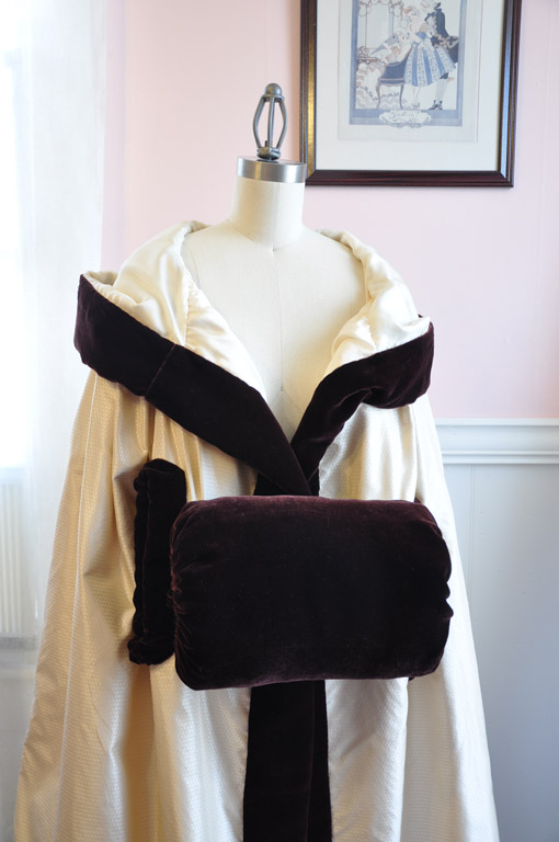 The cloak is lined in china silk and interlined with cotton flannel for warmth. I then bound the edges in silk velvet by hand to mimic the fur trimming. I also made a matching velvet muff cover to complete the look. Now I can move on...