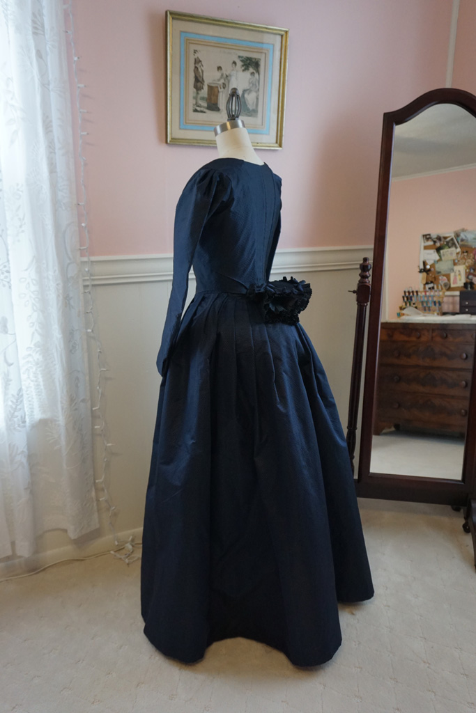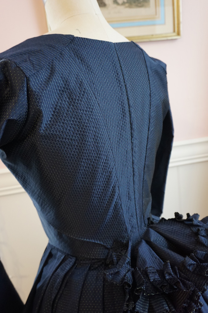 This time I decided to start my process completely from scratch. I browsed paintings, fashion plates, and extant garments until I had a solid idea of what I wanted – a jacket with short, fluffy skirt, cut-away front, long sleeves, and a matching petticoat. Then I focused on extant garments and pattern diagrams to help me alter my 18