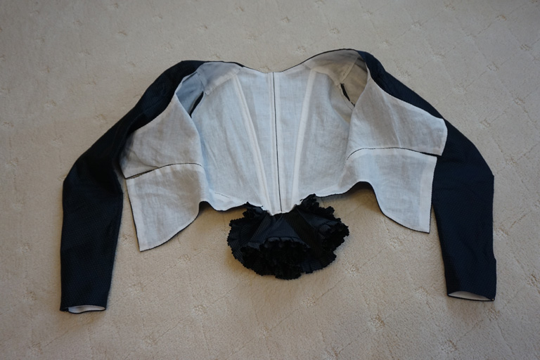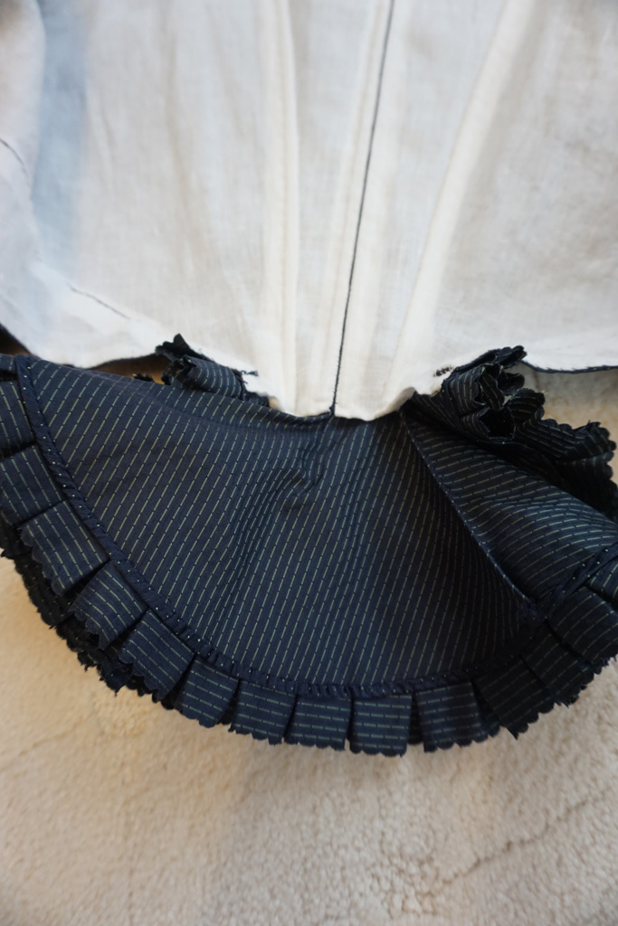 The skirt of the jacket was hemmed and then trimmed with scalloped pinked self-fabric strips, arranged in box pleats spaced about a half inch apart. I copied the trimming from the Les Arts Décoratifs jacket, but I also noticed similar trimming on other extant jackets, as well as in portraits.