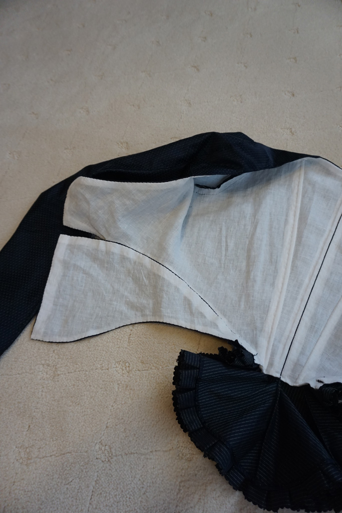 Since I had very limited fabric, and was reusing as much of the old jacket as possible, I didn’t have enough to cut a full underbodice section for the front of the jacket. My solution was cut a separate piece for the bottom front, finish the edges of the piece together with the lining, and then stitched it to the rest of the fronts. It’s not ideal, but works. The center fronts are left separate for about two inches to help it appear more like two layers, rather than one. I finished it with decorative buttons, but didn’t add buttonholes to keep the fit flexible in the future.