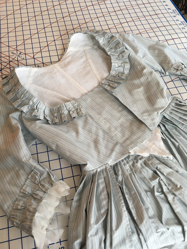 my mid-1780s blue stripe gown which no longer fit, and altered it to a 1790–4 shape.