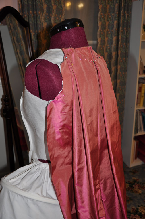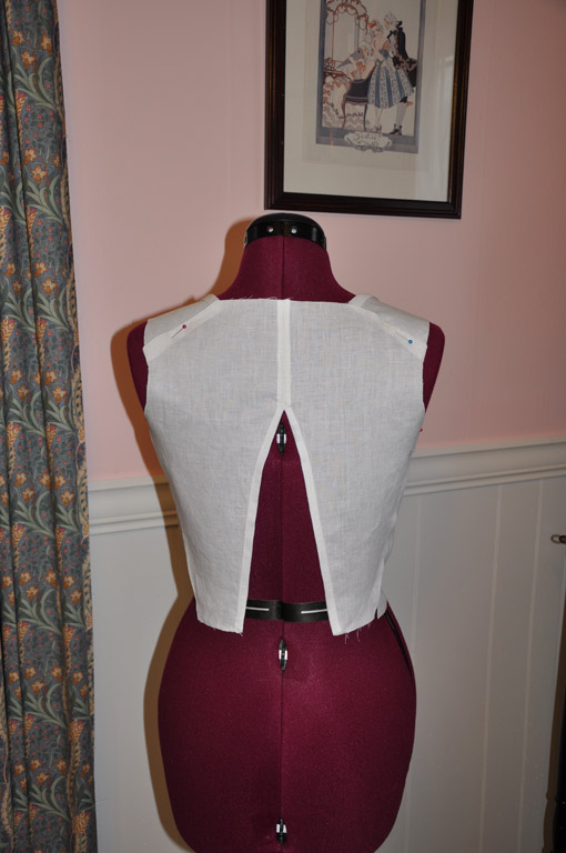 I started by creating a new fitted lining using my basic 18th century bodice as a base. The line lining has lacing and boing up the center back and I left a 2 in gap at the bottom for adjustability. The lining was assembled by machine and then I draped the back pleats directly onto the lining.