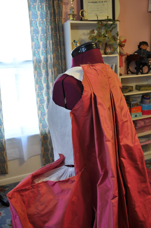 Each front piece is one half width of taffeta. I used the selvage for the robing and skirt edges and pleated the robings on to the lining at the shoulders first. The robings are a 2.5 inch knife pleat. After the shoulders, I continued the pleat down the front of the lining, leaving a ¼ inch over hang, which I turned under later. I then pinned a dart from bust to waist, hiding it under the robing. The excess fabric was smoothed to the side seam and the arm holes and shoulder seams were trimmed to match the lining. I tried on the dress to check the fit of the dart and adjusted the side seam as necessary. The excess fabric was trimmed from the side seam to one inch above the waist, like the back pieces, and the full width of fabric was left for the side skirt.