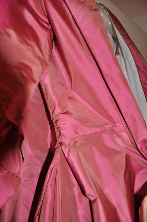 The side skirt pieces are one half-width of taffeta. The skirt pieces were sewn by machine and then pleated into two wide box pleats, which were stitched together at the top. These pleats meet at the center of the side seam and the top inch of the pleat is slipped between the lining and the taffeta. The pleats were then tacked to the taffeta and lining to support the weight of the fabric and to anchor the position of the pleats.