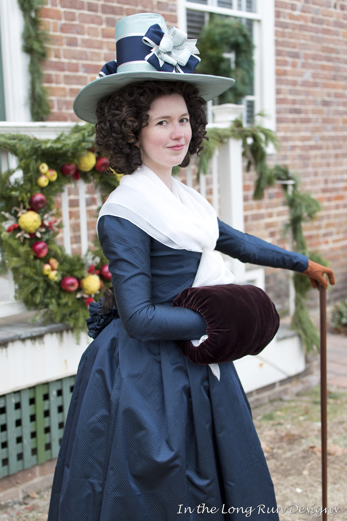 I made a new early 1790s tall hat to go with my jacket (more on that later), and a new large silk fichu. Because it was quite chilly, I wore my cream pelisse I made many years ago and carried a matching brown silk velvet muff. I also found a fantastic walking stick there in one of the historic shops, and it really completed the whole look.