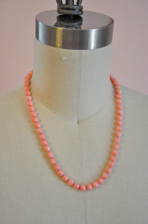 Red coral doesn’t go with a lot of my costumes, so I decided to make myself a pink one as well. I’m not sure how period correct pink coral is, but I really love the color. Again, the necklace is hand knotted and closes with a silver clasp.