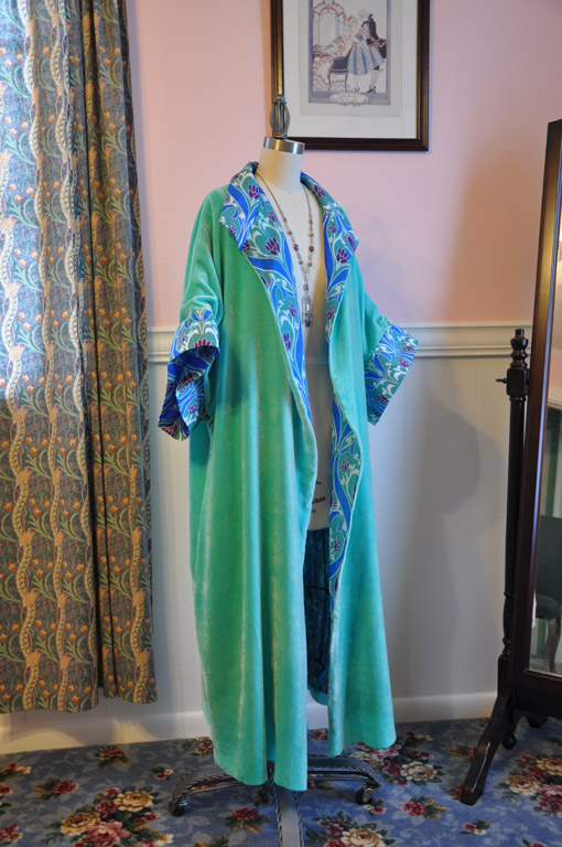 To line the robe, I bought a printed silk/cotton blend from Thai Silks. Its really lovely stuff - lightweight, drapey and soft. It would make a fantastic blouse, if only I had bought more! I was worried that my washing machine dye job (one packet of turquiose dye) wouldn't match the print, but thankfully they coordinate nicely.