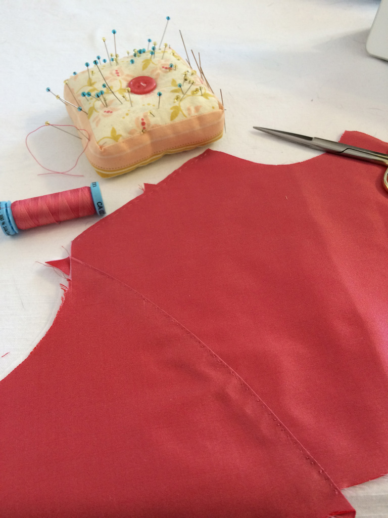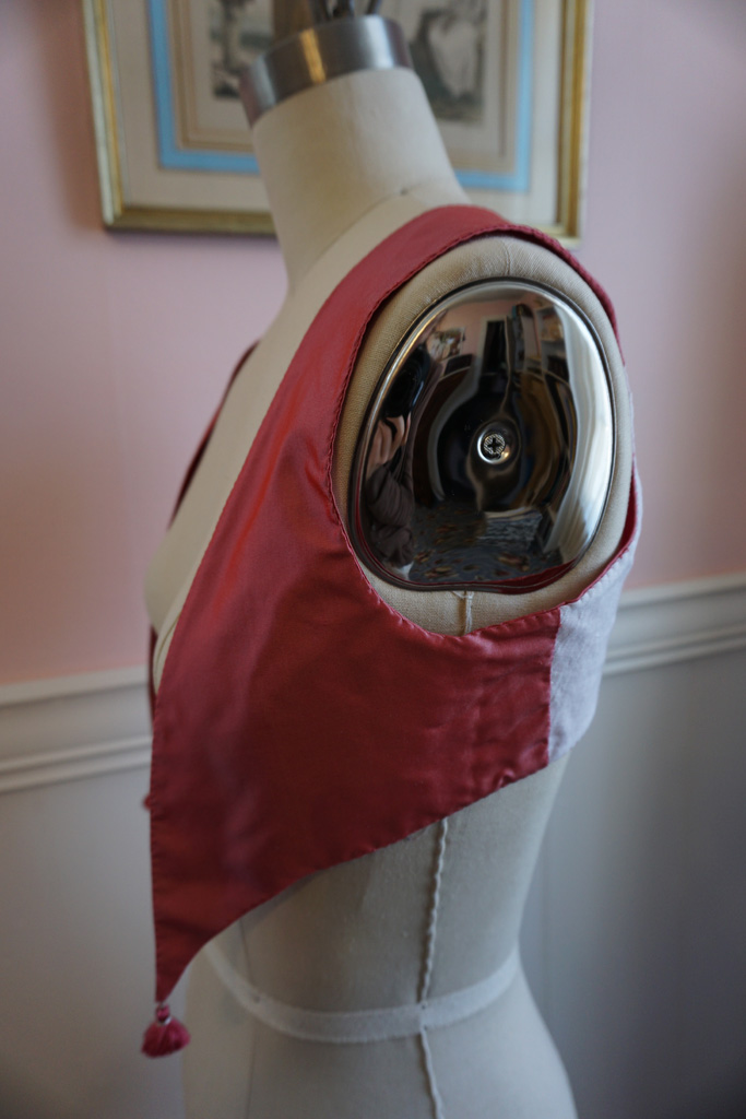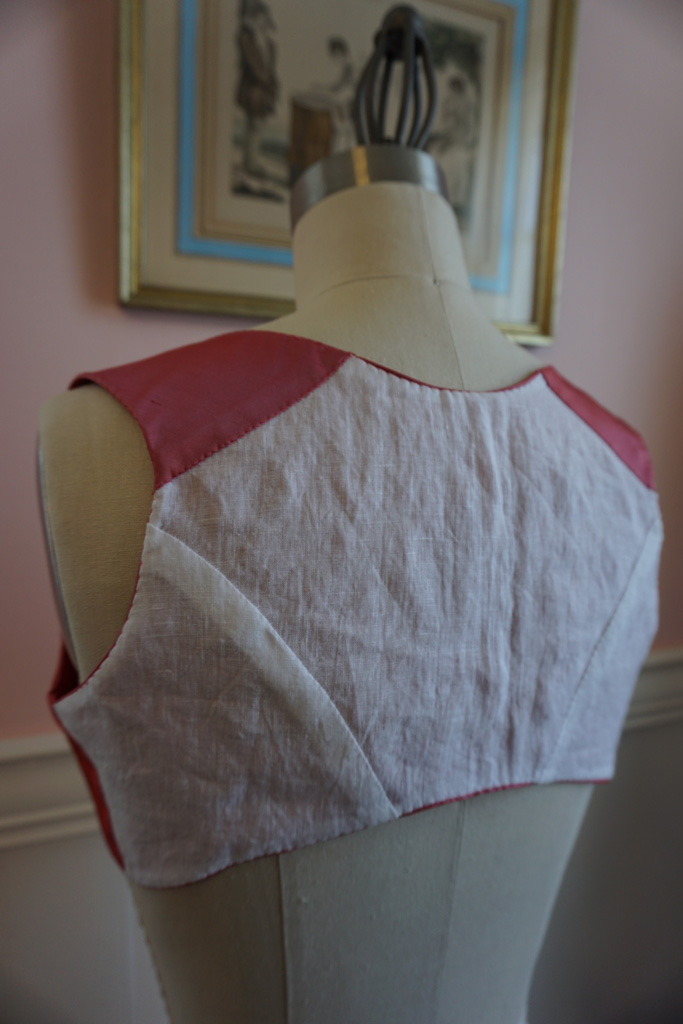 The spencer is made from a white and red crossed changeable silk taffeta, and the back and side back pieces are lined in a light weight linen, while the front is self-lined. It is hand sewn using my favorite late 18