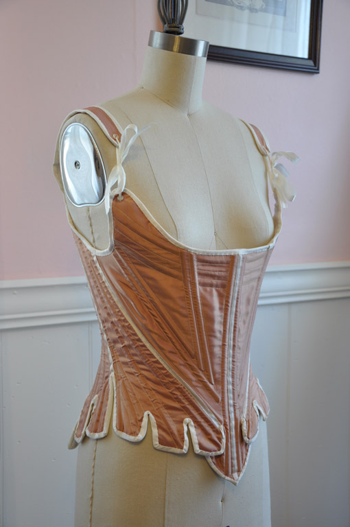 After the boning was inserted and the eyelets on the back were worked, I tried on my stays to check the fit before moving on to binding. I am incredibly glad I did! It was too big! In fact I could lace the stays completely closed. Otherwise, the shape on my body was great, so I ripped out the lining and boning, and took the stays in at the center front and at the two back seams. I left the center back alone, since certainly didn’t want to have to redo all those eyelets! To finish, I added decorative ivory silk ribbon along the seam lines and bound the stays in ivory cotton (since it was all I had on hand).