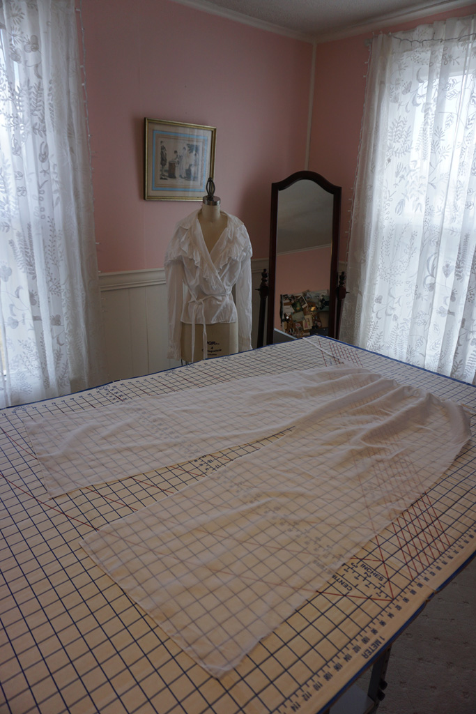 When I was making my version, I focused on the two portraits above. I loved the large oversized collar and the ruffle. They actually reminded me of my habit shirt worn open, so I used that as my construction reference, as well as the Larkin and Smith Men’s Shirt Guide, making it sleeveless so it could be worn under more things. The chemisette is made from Swiss Muslin from Farmhouse Fabrics, and hand sewn with fine silk thread. I only had a yard of fabric so careful measuring and planning was required. I also took the time to pull threads to get straight lines for all my cuts.