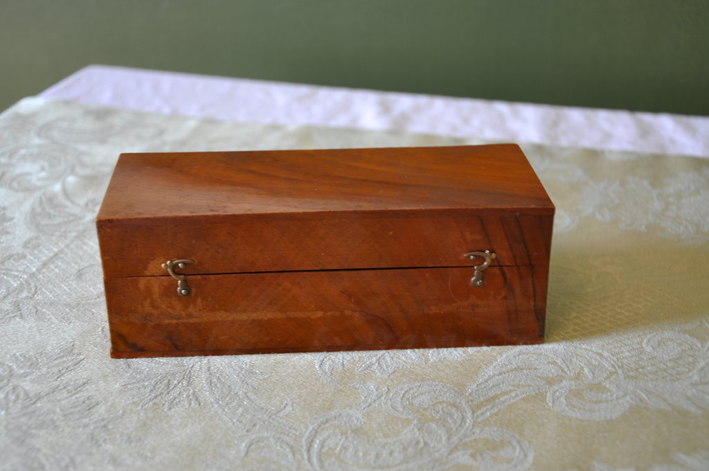The microscope was sold as a travel or field microscope and it’s quite perfect for my purposes. The microscope is brass or brass colored metal and comes in its own polished wood carrying case. Its only about six inches long, making it a convenient prop. To work the microscope, the barrel slides up and down and there is an adjustable mirror under the lens to catch the light. It’s a little hard to get enough light to properly see the slides, but when you can all the lenses are in working order. I’m not sure of the age, but I would guess it’s from the late 1800s or early 1900s. Anyone know?