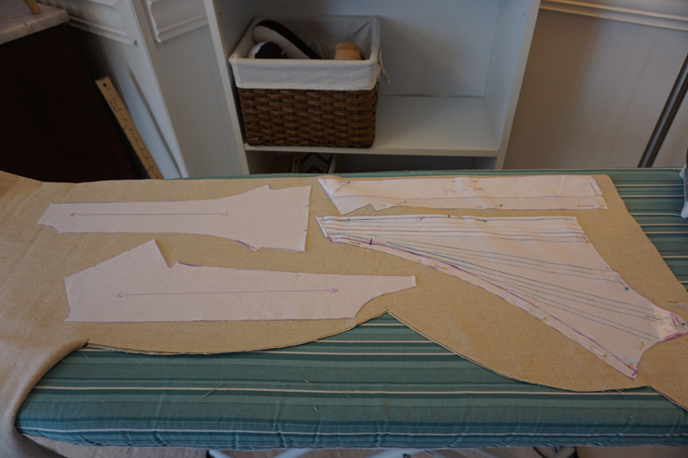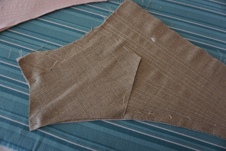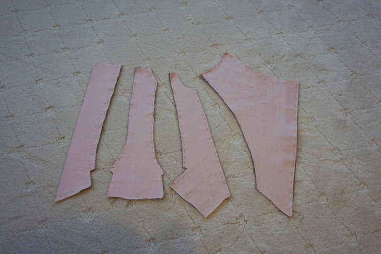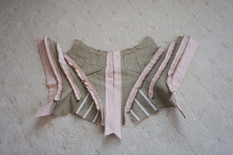 The stays are made from two layers of linen buckram for the inner structure and a layer of pale pink linen as the outer fabric, and is mostly machine sewn. The boning channels were stitched on each piece individually, and then the stays were assembled.