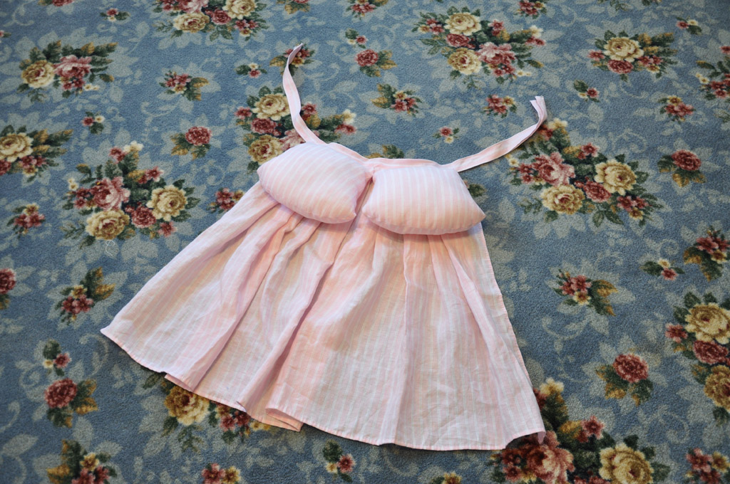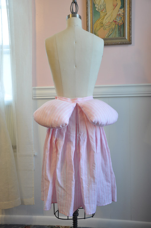 My new rump is made from pale pink striped linen (to match my petticoat and other undies, because I’m cool like that). It is two separate pillows attached to a half petticoat. Each piece was assembled separately and then the pillows were whipstitched to the petticoat waistband. I have no idea if this is how it was constructed in the period, but it seemed logical to me.