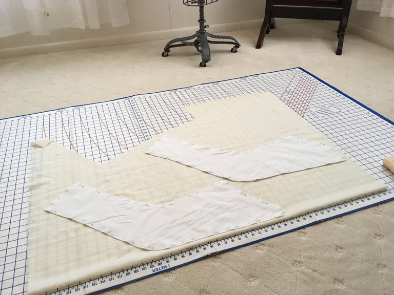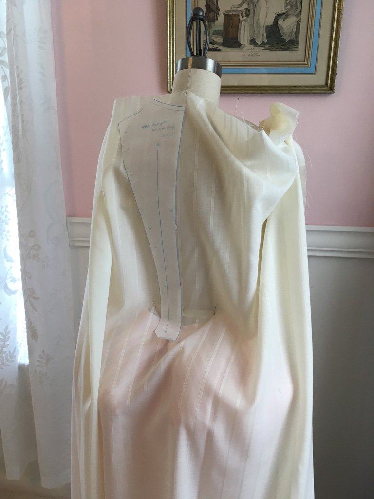 One of the hallmarks of a redingote seems to be the fact that the back bodice pieces are cut in one with the skirt. The LACMA pattern shows both the center back and side back pieces cut in one; however, I found a couple of extant examples that appear to have just the center back pieces connected to the skirt. To cut the back, I measured the approximate length of the panel on my form, folded it in half, and then laid the center back pattern piece about 2.5 inches from the fold. I cut out around the pattern piece, stopping 1.5 inches from the waist, and leaving 2.5 inches of excess about this on the side back seam side for pleating the skirt later.