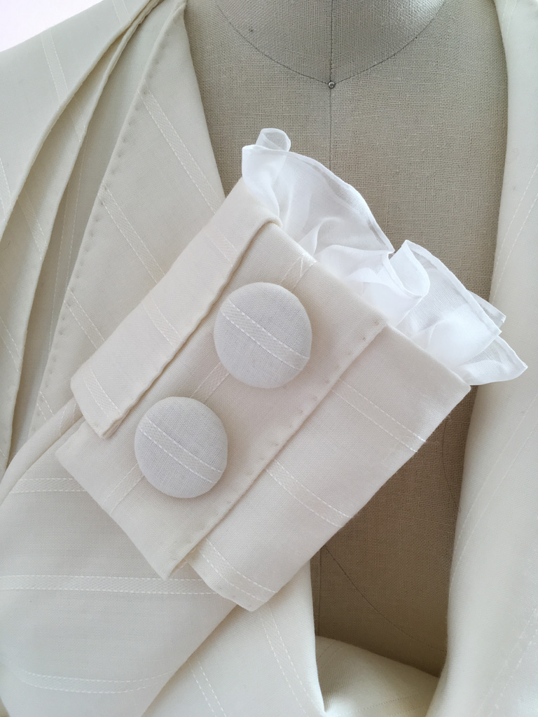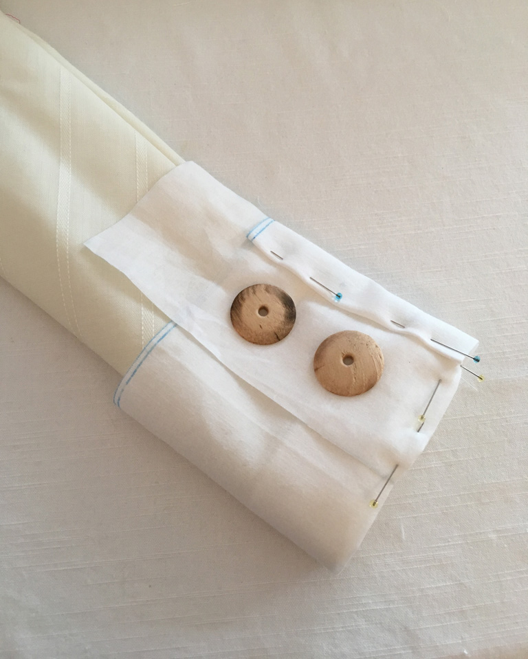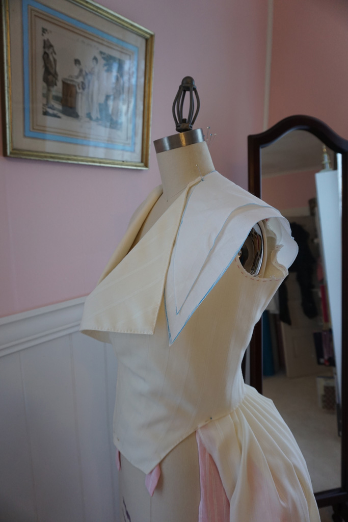 this extant example. They have decorative self-fabric buttons that match the buttons on the bodice. I chose to close it with pins vs. actual buttonholes to leave myself some adjustability should my weight change or shift.