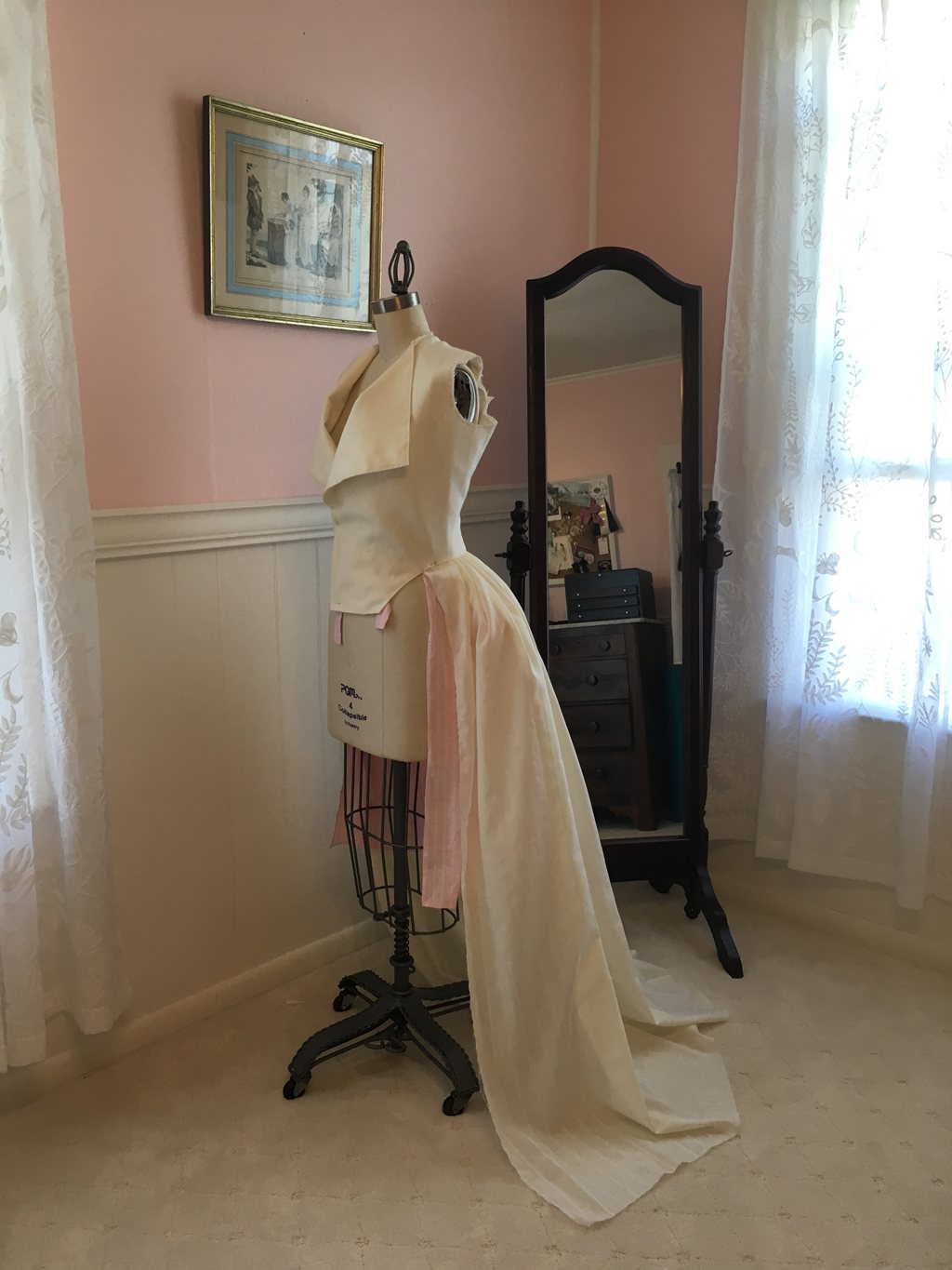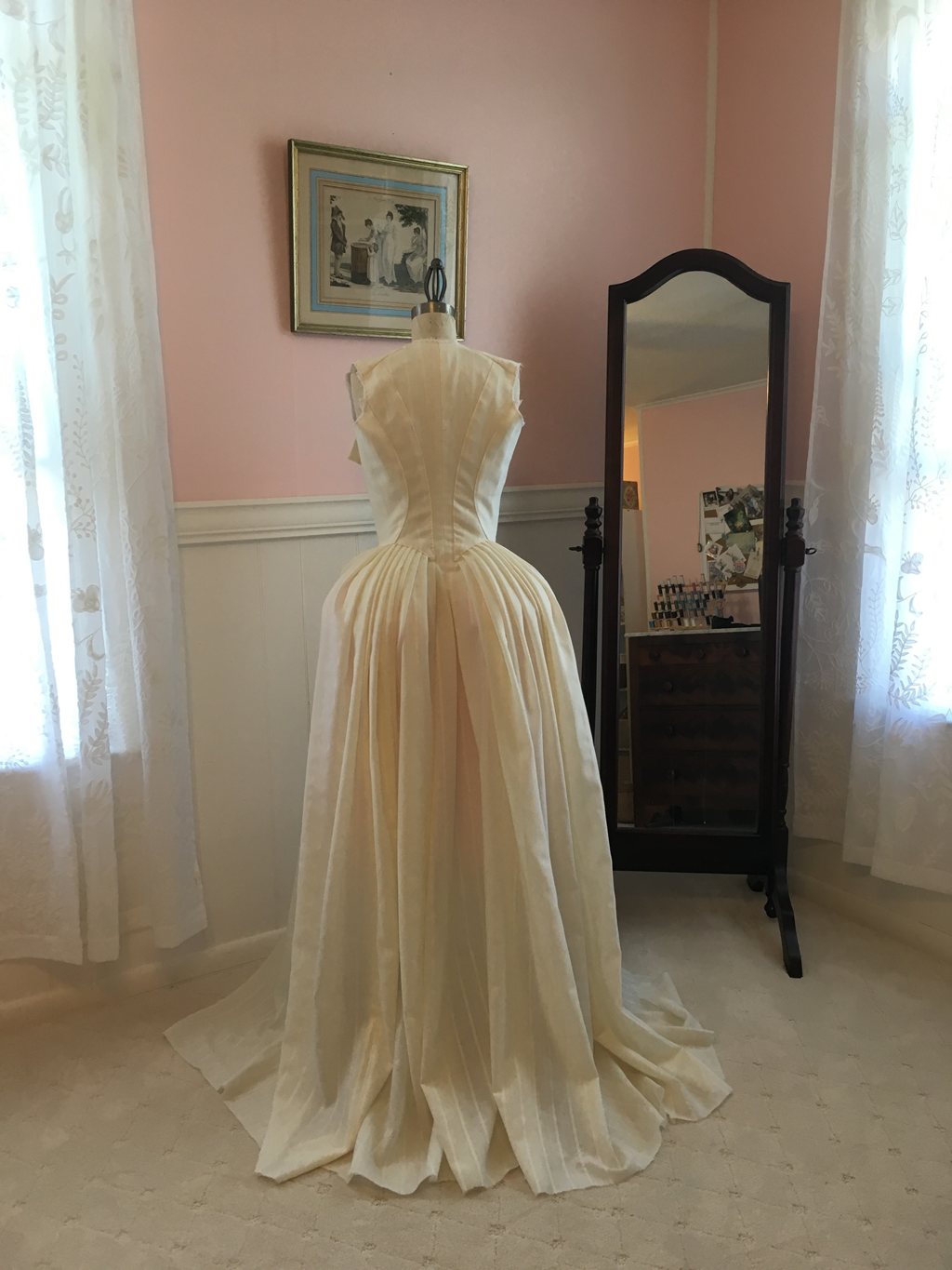 Since my fabric was sheer and delicate, I flat lined each bodice piece in a lightweight linen. The linen was hand basted to each piece of wool and then the pieces were assembled, started with the back. The center back seam was sewn all the way down to the end of the lining, and the excess formed a box pleat behind the seam, and was tacked above the waist. Then the side back, and front pieces were attached, and the skirt portion of the back pleated in place. I added another panel to each side of the skirt, pleated it, and then leveled the skirt over the false rump.