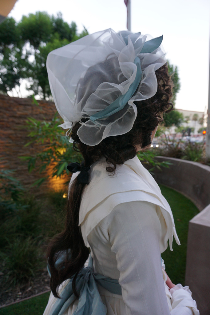 The week before Costume College, I made a cap using silk gauze from Burnley and Trowbridge, hand sewn with heirloom cotton thread. (I can’t praise this stuff enough when it comes to sewing sheer fabrics!) The cap pattern was based off my other caps I had previously made, which have been in turn based off the Kannik’s Korner pattern. It’s the same basic shapes, simply massively enlarged to make a giant confection of a cap. And yes, I did use the selvedge edge for the ruffles because a) its pretty and b) I was on a time crunch. Since I had no ribbon to match my sash, I used more of the same taffeta to decorate the cap.