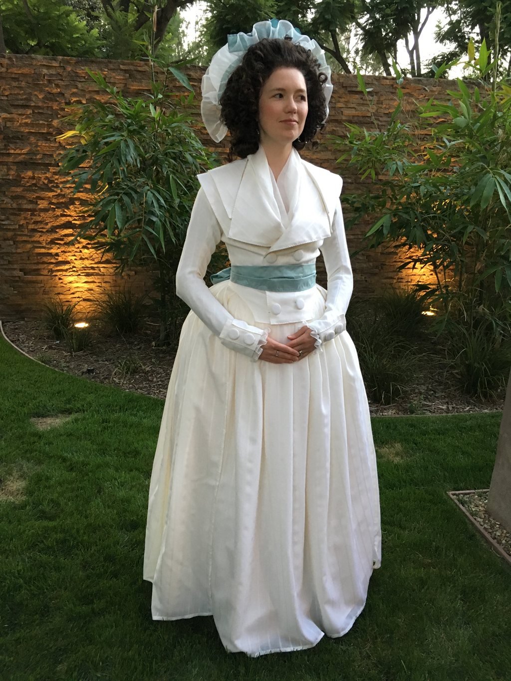 Several years ago, I saw a portrait by George Romney at The Huntington Library and Gardens, and I immediately knew I had to reproduce it one day. The sitter, Susannah (Miller) Lee Acton, is wearing a cream redingote with wide lapels and huge capes. She has a large gauzy cap and fichu, and her waist is accentuated by an aqua silk sash that matches the ribbons decorating her cap. How could I not instantly fall in love?