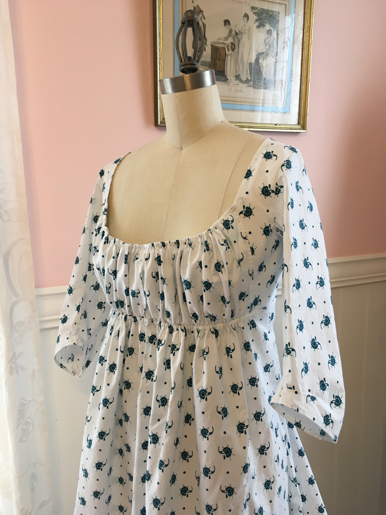 I wanted a new comfy (and more importantly cool) dress to wear at the Jane Austen Festival this year. Since I was behind on my sewing schedule I decided to stick with what I know and love and made yet another late 1790s gathered front dress. Honestly, I don’t get tired of these. The style is so easy to wear and the gathers mean the sizing is very forgiving. And with a busy small scale print, it means I can worry less about the inevitable dirt and stains that come with picnicking at an outdoor event.